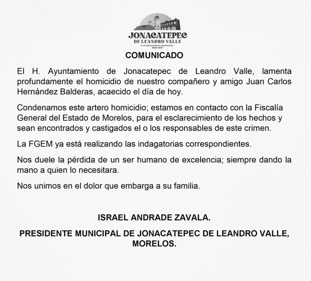 A través de un comunicado, el Ayuntamiento de Jonacatepec, encabezado por Israel Andrade Zavala, condenó los hechos en el que fue asesinado el director de la policía municipal, y piden a la Fiscalía del Estado esclarezcan el homicidio y castiguen a los responsables