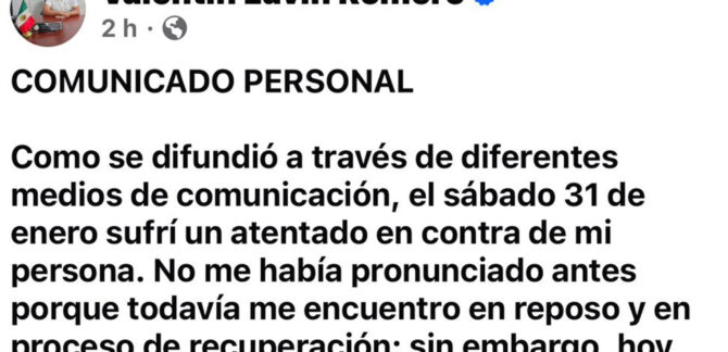A través de sus redes sociales, el presidente municipal de Temoac, Valentín Lavín Romero informó que presentó una licencia para separarse del cargo mientras lleva a cabo su proceso de recuperación, tras la agresión, a balazos que sufrió el pasado fin de semana En un comunicado que dio a través de sus redes sociales, el … Sigue leyendo VALENTÍN LAVÍN SOLICITA LICENCIA TEMPORAL TRAS ATENTADO